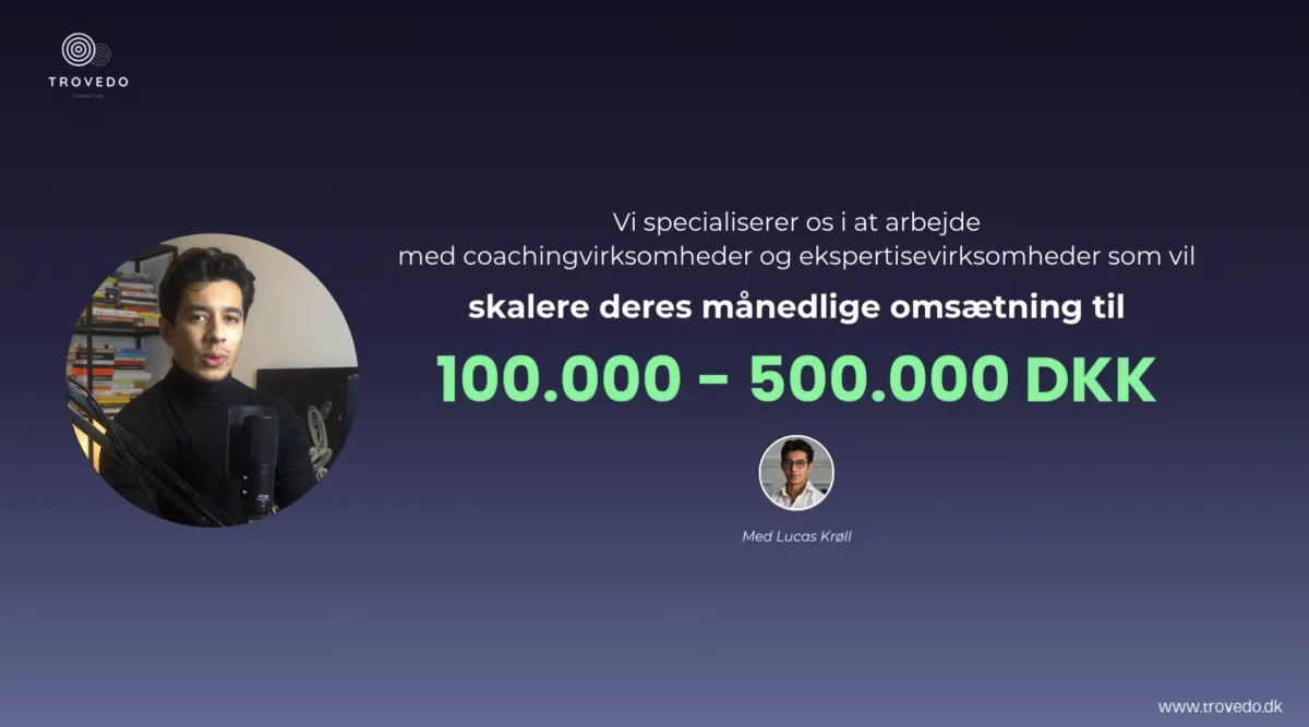 Første skridt for dig er at se videoen, hvor jeg viser, hvordan vi hjælper eksperter og coaches med at skalere deres månedlige omsætning til 100.000-500.000 kr., samtidig med de kun bruger tiden på det som de elsker